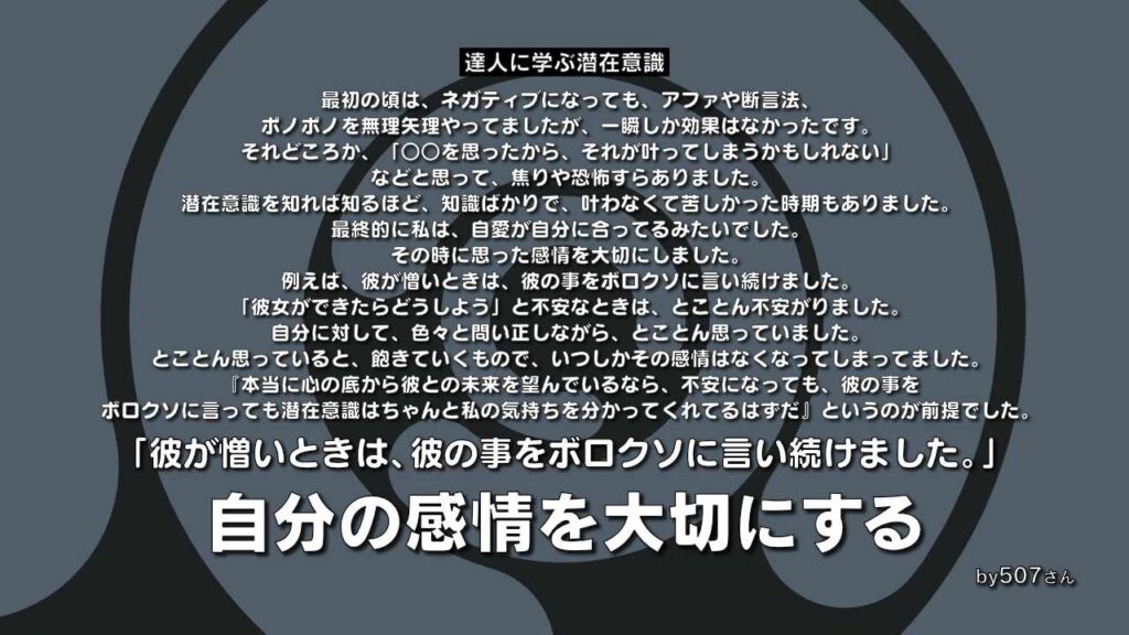 『本当に心の底から彼との未来を望んでいるなら、不安になっても、彼の事をボロクソに言っても潜在意識はちゃんと私の気持ちを分かってくれてるはずだ』というのが前提でした。