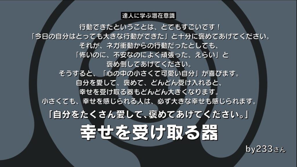 199式アファメーション、イメージング、紙に書くこと、自分の声を録音して聞くことなど、色々と手を出したので、どれが上手くいったのか分かりません。