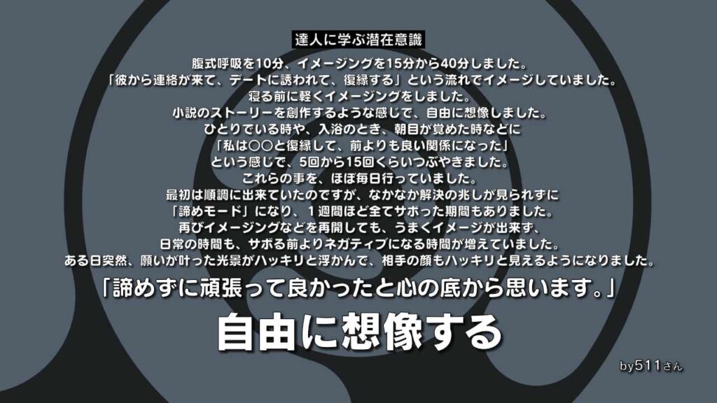 成功しているかいないかも分からないままイメージングを続けていったある日突然、願いが叶った光景がハッキリと浮かんで、相手の顔もハッキリと見えるようになりました。