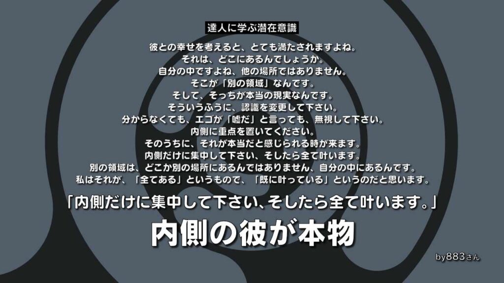 【復縁】「内側の彼が本物」内側だけに集中して下さい、そしたら全て叶います。別の領域は、どこか別の場所にあるんではありません、自分の中にあるんです。そして、そっちが本当の現実なんです。