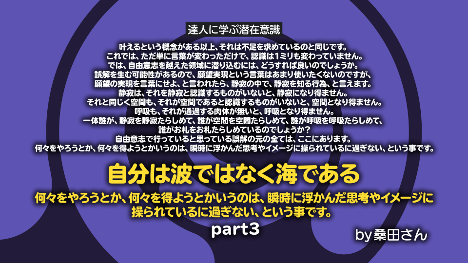 「何々をやろう」とか、「何々を得よう」とかいうのは、「瞬時に浮かんだ思考やイメージに操られているに過ぎない」という事です。