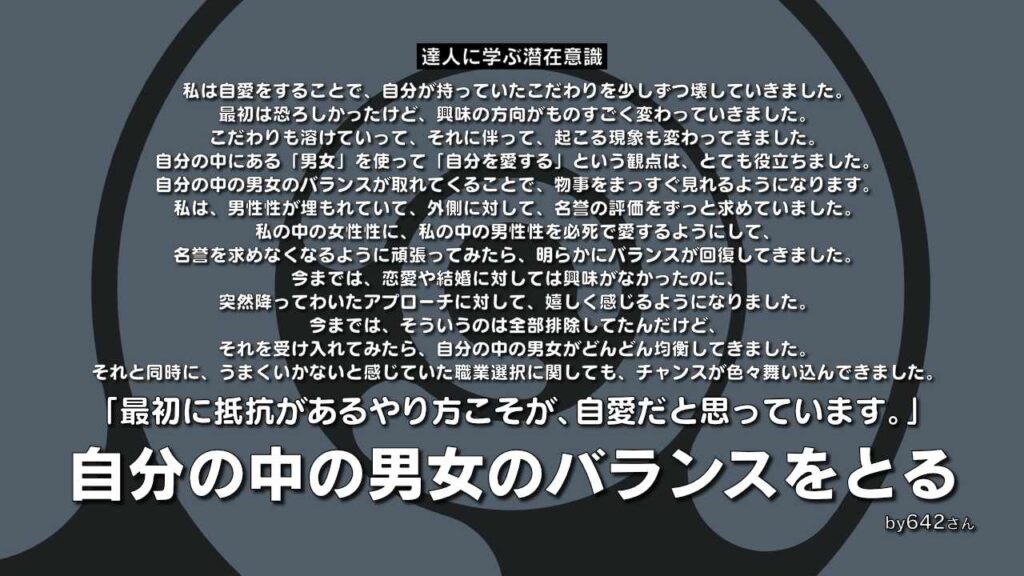 自分の中にある「男女」を使って「自分を愛する」という観点は、とても役立ちました。