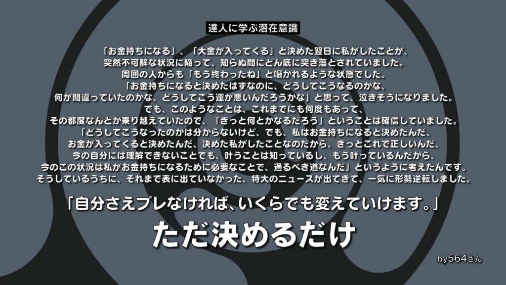 「どうしてこうなったのかは分からないけど、でも、私はお金持ちになると決めたんだ、お金が入ってくると決めたんだ、決めた私がしたことなのだから、きっとこれで正しいんだ、今の自分には理解できないことでも、叶うことは知っているし、もう叶っているんだから、今のこの状況は私がお金持ちになるために必要なことで、通るべき道なんだ」というように考えたんです。