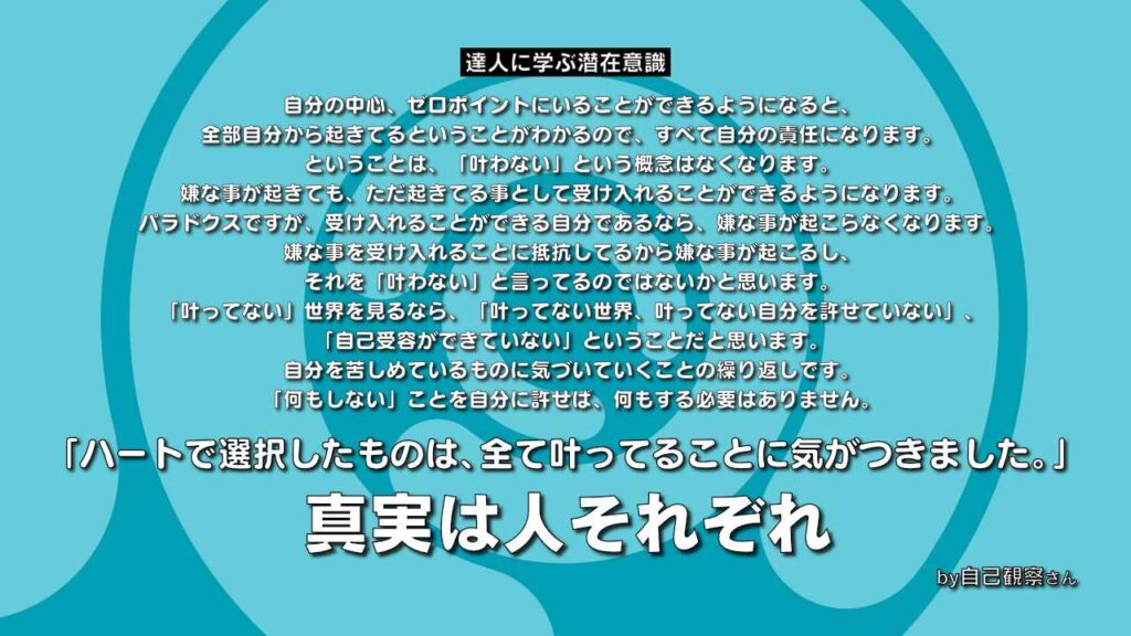 「叶ってない」世界を見るのであれば、「叶ってない世界、叶ってない自分」を許せていない、自己受容ができていない」ということだと思います。