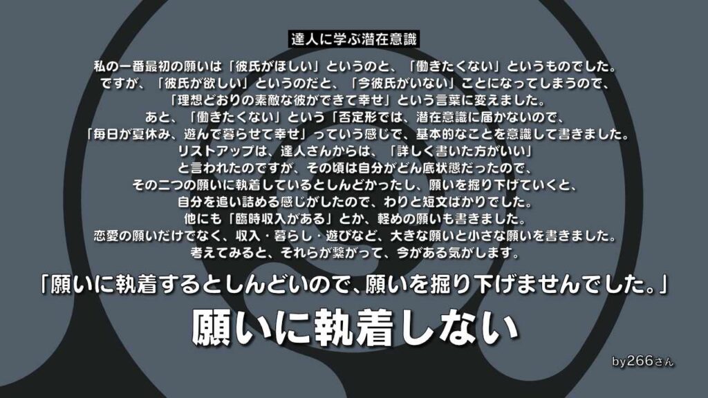 あと、「働きたくない」という「否定形では、潜在意識に届かないので、「毎日が夏休み、遊んで暮らせて幸せ」っていう感じで、基本的なことを意識して書きました。