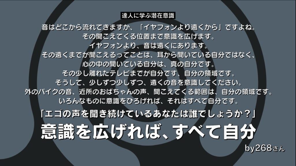 エゴが心の声でしゃべるのを聞くように、イヤフォンの音をなぞってください。