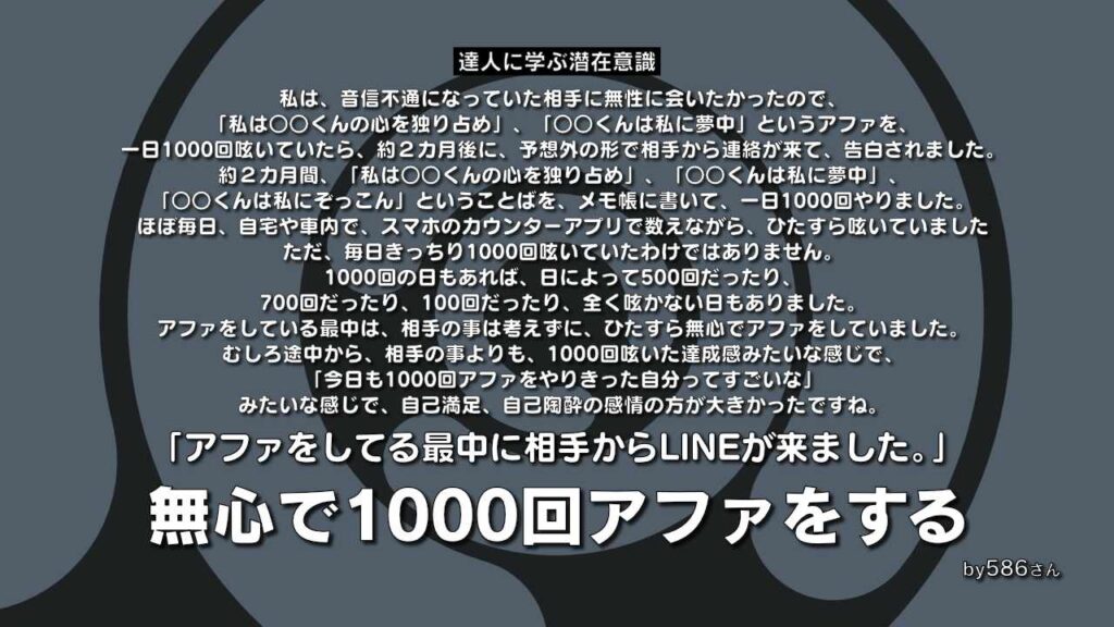 途中からは、相手の事よりも、1000回アファをした達成感の方が強かったですね。