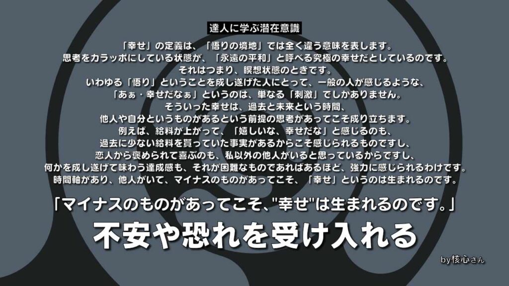 もちろん、認識の変更によって、恐怖や不安を和らげることは出来ますが、一切ネガティブを感じないようにするのは、幸せや刺激も感じないようにしていることと一緒です。