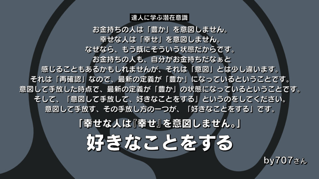 【解釈】「好きなことをする」お金持ちの人は「豊か」を意図しません。なぜなら、もう既にそういう状態だからです。そして、「意図して手放して、好きなことをする」というのをしてください。