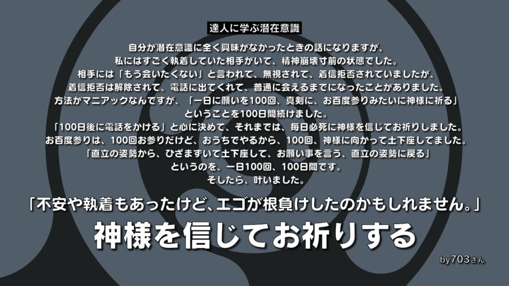 方法がマニアックなんですが、「一日に「願いを100回、真剣に、お百度参りみたいに神様に祈る」ということを「100日間続けました。