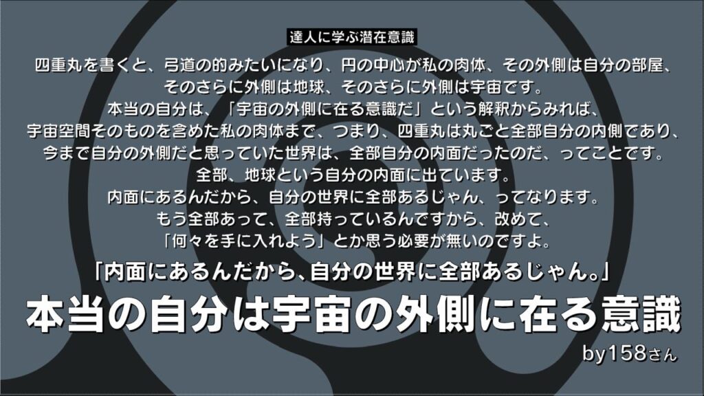 「本当の自分は、宇宙の外側に在る意識だ」という解釈からみれば、宇宙空間そのものを含めた私の肉体まで、つまり、四重丸は丸ごと全部自分の内側であり、今まで自分の外側だと思っていた世界は、全部自分の内面だったのだ、ってことです。