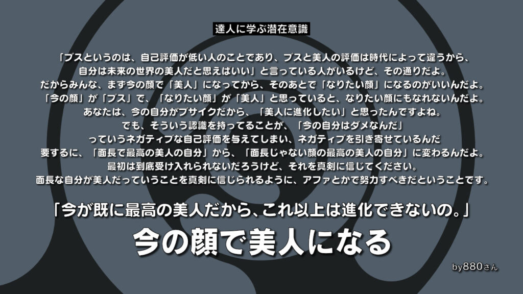 「今の顔」が「ブス」で、「なりたい顔」が「美人」と思っていると、なりたい顔にもなれないんだよ。