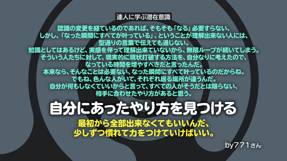 達人の言葉も頭では理解できるが、実感を伴っていないので今一腑に落ちないというか、信じ切れていないから、「なる」をしていても軸が定まっておらず、なっても、ふと叶ってないと思ってしまい、もう一度なる、という状態がずっと続いているんだ。